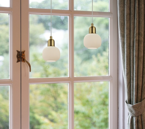 Fina Elin, från Aneta Belysning, är en fönsterlampa gjord i opalglas med topp i matt mässing och passar utmärkt att hänga solo över ett sidobord eller i kluster över ett bord eller över en öppen arbetsyta i köket.