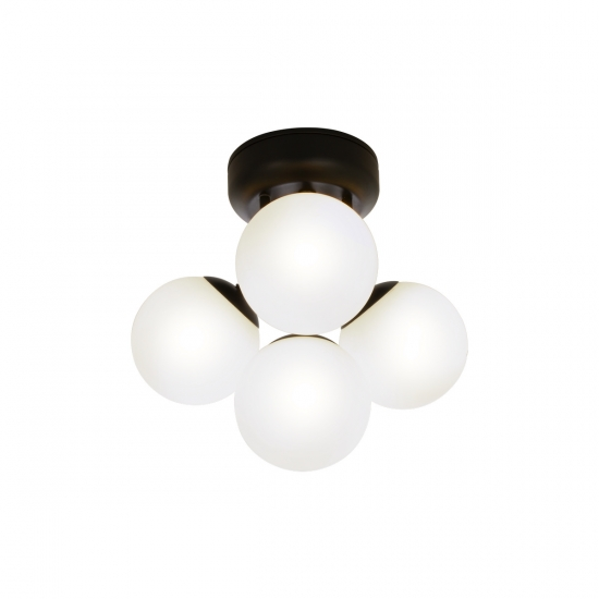 Eleganta Nicosia, från Aneta Belsyning, är en stilren plafond med takplatta i svartlackerad metall som möt av fyra stycken opala glasglober.