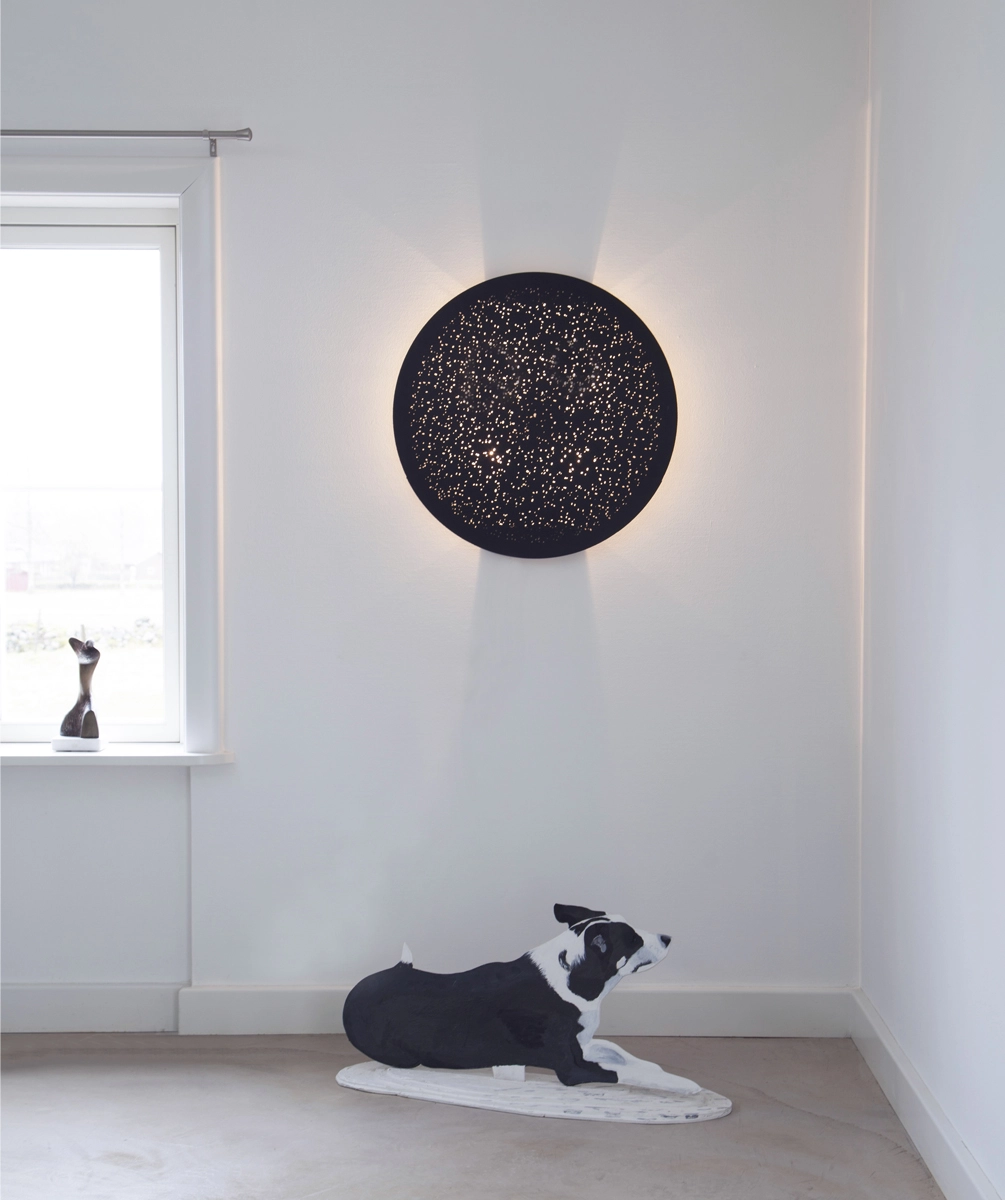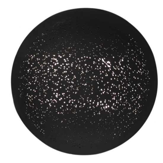 Colby är en vägglampa som ger wow-effekt. Lampan är rund med en diameter om 71 cm och tillverkad i svart metall med små perforerade hål s om gör det möjligt för ljuset att sippra ut och skapa fina ljuseffekter. Lampan är bestyckad med 4 st E14 ljuskällor och har en klar kabel för montering på vägg.
