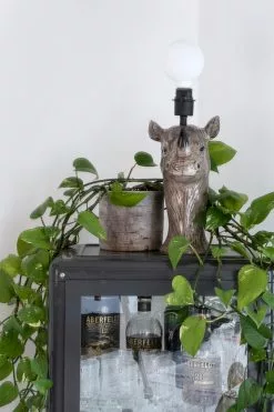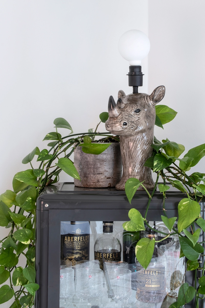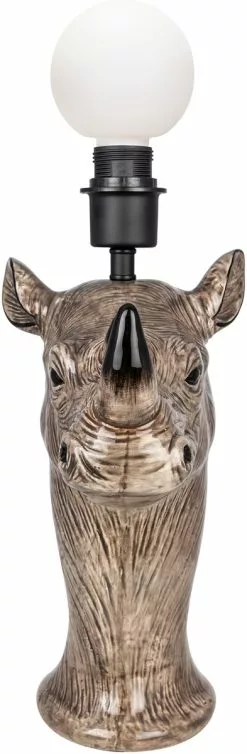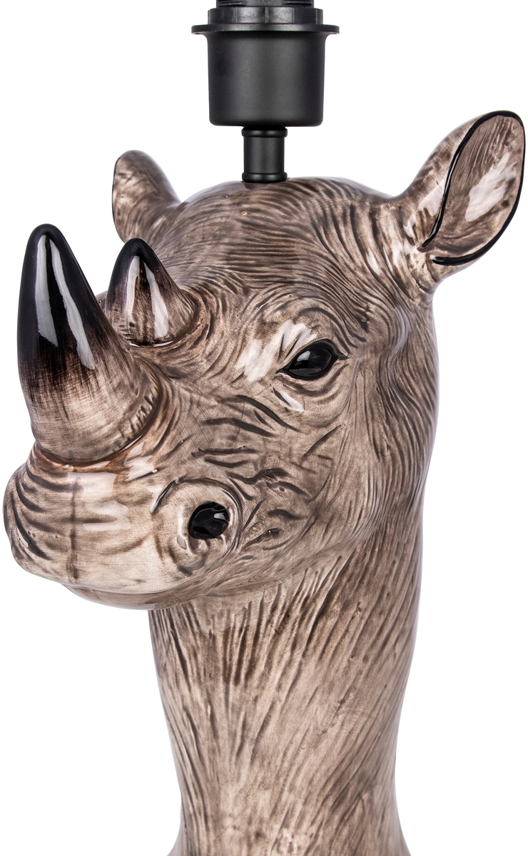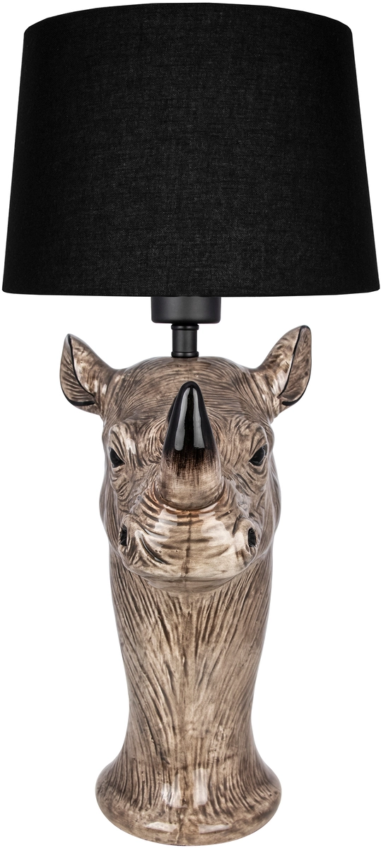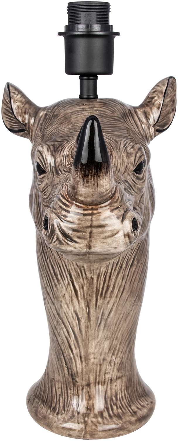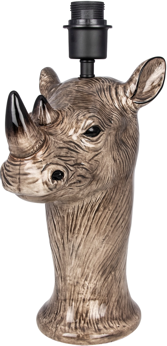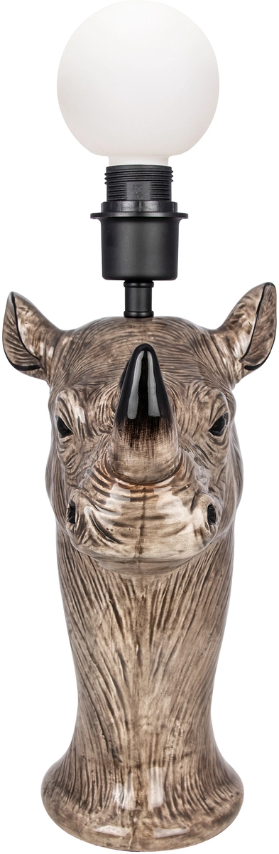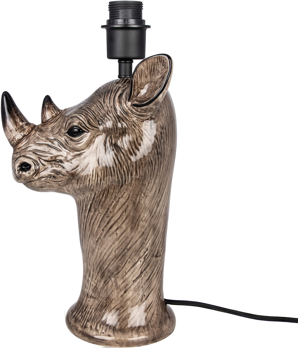 Rhino är inspirerad av Afrika och dess vilda djurliv i kombination med handmålad keramik. En detaljerat handmålad och vacker lampa som ger en trendig och kitschig känsla i hemmet, passar lika fint med endast ljuskälla som med skärm (ej inkluderat). Rhino har en 200 cm lång transparent kabel med brytare och lamphållare i svart metall. Bredd: 20 Djup: 16 Höjd: 38 (cm) Lamphållare: 1xE27 Max 60W