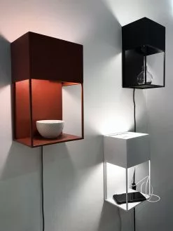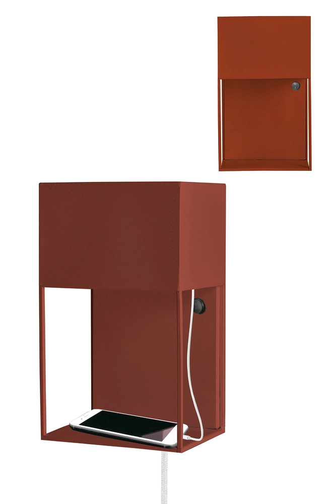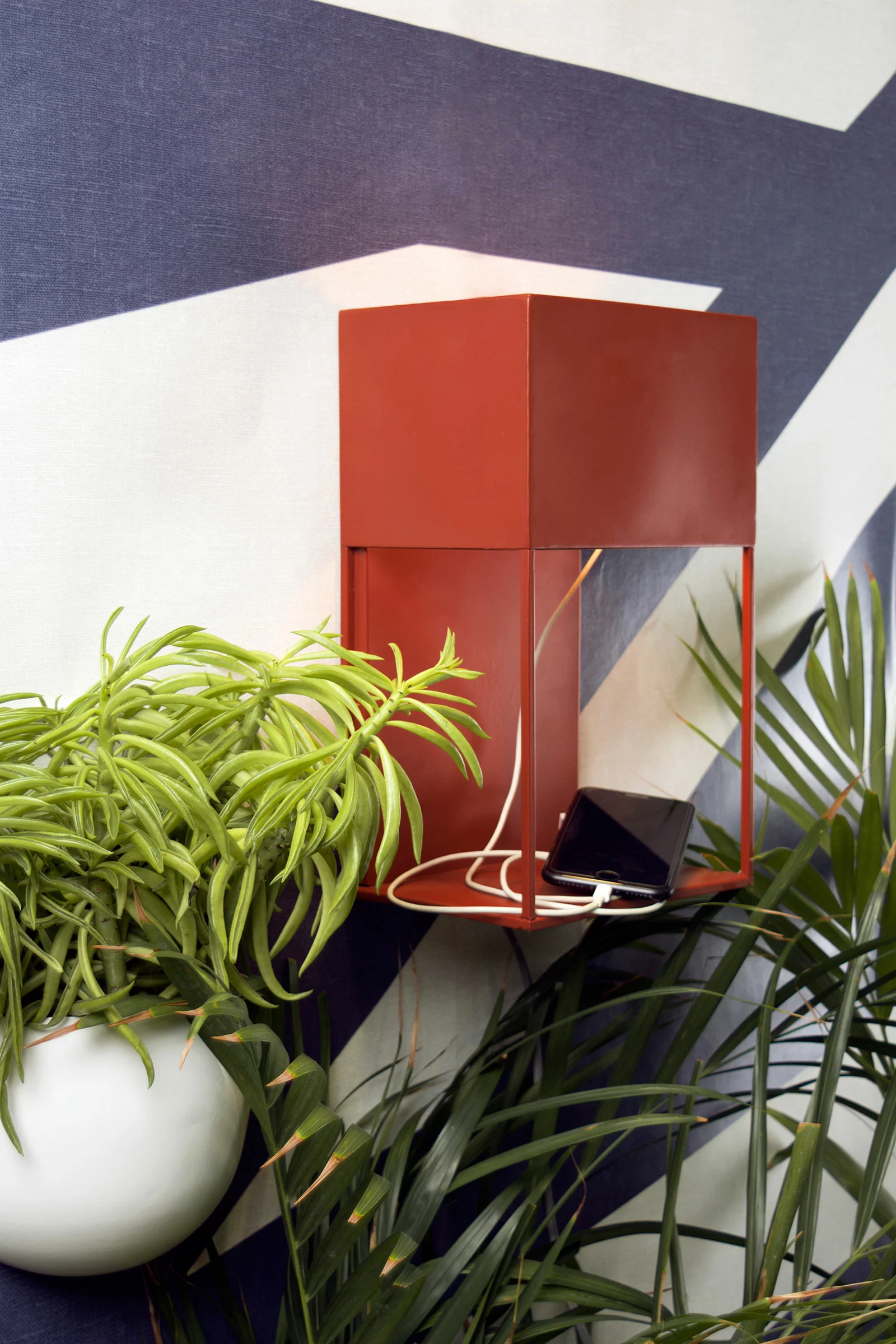 Vägglampa i roströdlackerad metall med hyllplan. Mycket lämplig att ha vid sängen. Går både att hänga upp samt ställa på ett bord. Utrustad med USB uttag för telefon. Vit textilkabel, stickpropp samt brytare på väggplattan. Höjd 30 cm Bredd 18 cm ut från vägg 13 cm. Lamphållare: E14 Max 40W. Rekommenderad glödlampa: L169. Design: Malin Lundmark