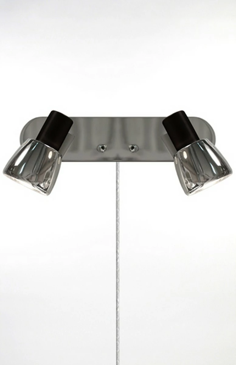Väggläslampa i metall gjord med bakplatta och skärm i krom samt lamphus i svart. Dekorativ hålrad på kupan. Transparent kabel med brytare på väggplattan. Höjd 7 cm Bredd 30 cm ut från vägg 12 cm Lamphållare 2 x E14 Max 40W Rek. Glödlampa: Klot Matt LED
