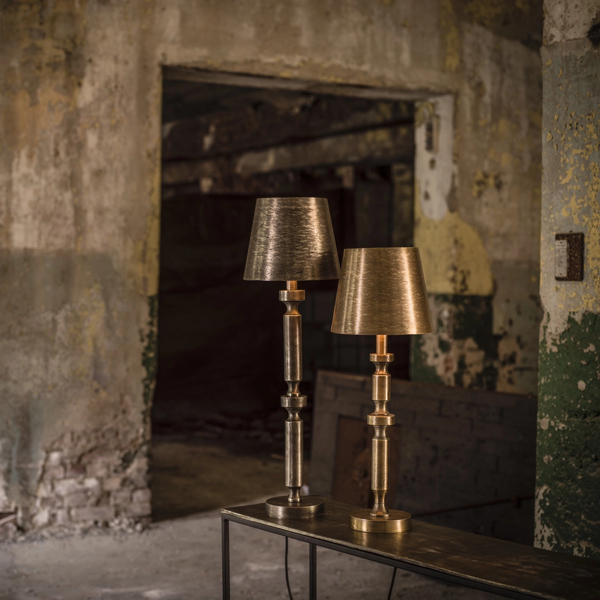 Lampfot Balder i metall har en vacker form med en rustik finish. Råmässing finish. 1,8 m svart plastsladd med strömbrytare ca 30cm från lampan. Höjd 56cm, bredd 12,5cm och djup 12,5cm. E27 sockel. Max 40W. IP20. Ljuskälla ingår ej. Passar med en skärm upp till 25cm i diameter.